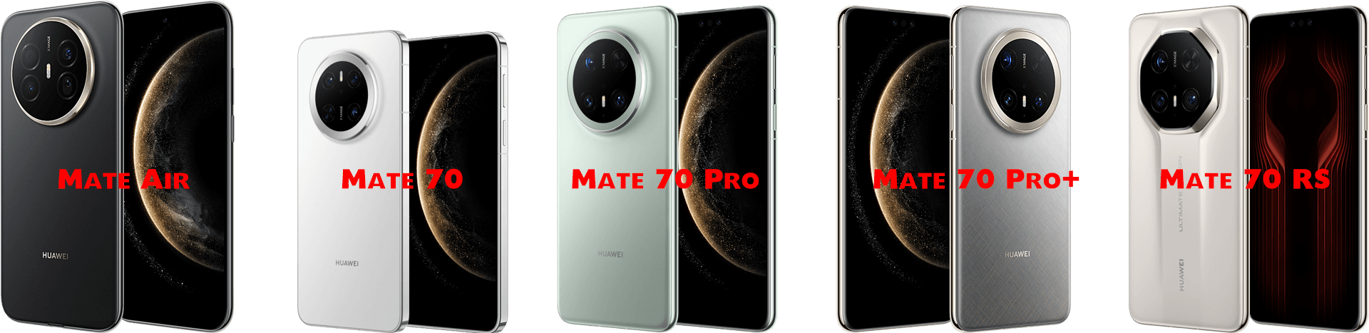 - Mate 70 Air:7寸2760×1320挖孔屏[120Hz];侧边指纹;麒麟9020B(16GB运行内存版本为麒麟9020A);后摄5000万+800万超广角+1200万长焦+150万多光谱通道红枫原色摄像头,前摄1070万超广角;电池6500mAh[66W];NFC,Wi-Fi 7,红外,北斗卫星消息;约208克;12GB运行内存版本2025年11月11日开售,16GB运行内存版本2025年12月27日开售