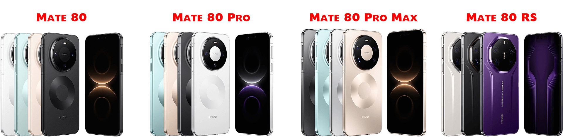- Mate 80 Pro:6.75寸2832×1280挖孔屏[120Hz];3D人脸识别+侧边指纹;12GB运行内存版本为麒麟9030,16GB运行内存版本为麒麟9030 Pro;后摄5000万+4000万超广角+4800万微距长焦+第二代红枫原色摄像头,前摄1300万超广角;电池5750mAh[100W+80W];USB-C[5Gbps],NFC,Wi-Fi 7,星闪,红外,北斗卫星消息,畅连无网通信;约219克;2025年11月28日开售