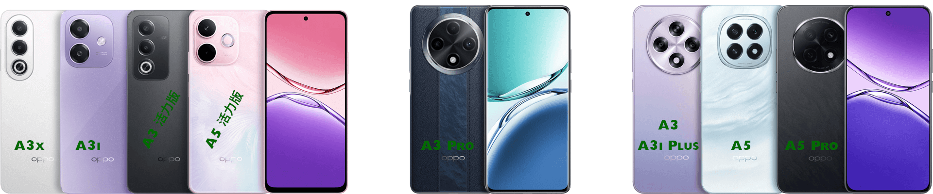 | A3x | 6G+128G | 暗夜紫:780元 | 星光白:780元 | 云羽粉:780元 | | 8G+256G | 暗夜紫:1050元 | 星光白:1060元 | 云羽粉:1030元 | | A3i | 8G+256G | 静夜黑:890元 | 星辰紫:890元 | | 12G+256G | 静夜黑:1090元 | 星辰紫:1095元 | | A3i Plus | 12G+256G | 水墨黑:1120元 | 冷晶紫:1160元 | 松叶绿:1120元 | | 12G+512G | 水墨黑:1260元 | 冷晶紫:1270元 | 松叶绿:1260元 | | A3 Pro | 12G+256G | 远山蓝:元 | 天青:1450元 | 云锦粉:元 | | 12G+512G | 远山蓝:1480元 | 天青:元 | 云锦粉:1480元 | | A5x | 8G+256G | 玄武黑:1150元 | 钻石白:1150元 | 水晶粉:1150元 | | 12G+256G | 玄武黑:1320元 | 钻石白:1320元 | 水晶粉:元 | | A5 活力版 | 12G+256G | 琥珀黑:1260元 | 玉石绿:1260元 | 玛瑙粉:1260元 | | 12G+512G | 琥珀黑:1480元 | 玉石绿:元 | 玛瑙粉:1480元 | | A5 | 12G+256G | 锆石黑:1560元 | 云母蓝:1560元 | 晶钻粉:1560元 | | A5 Pro | 12G+256G | 磐石黑:1820元 | 石英白:1820元 | 砂岩紫:元 | | 12G+512G | 磐石黑:2060元 | 石英白:元 | 砂岩紫:2060元 | | A6i | 6G+128G | 午夜黑:元 | 云雾白:元 | | 8G+128G | 午夜黑:元 | 云雾白:元 | | 8G+256G | 午夜黑:元 | 云雾白:元 | | A6 Max | 8G+256G | 流光白:元 | 岩雾蓝:元 | | A6 GT | 12G+512G | 流光白:1980元 | 岩雾蓝:1980元 | 莹彩粉:1980元 | | A6 | 12G+256G | 丝绒灰:1595元 | 蓝海浮光:1595元 | 粉梦生花:1595元 | | 12G+512G | 丝绒灰:1780元 | 蓝海浮光:1780元 | 粉梦生花:1780元 | | A6 Pro | 16G+256G | 墨玉黑:2030元 | 青云平步:2030元 | 流水生金:2030元 | | 16G+512G | 墨玉黑:2295元 | 青云平步:2295元 | 流水生金:2295元 |